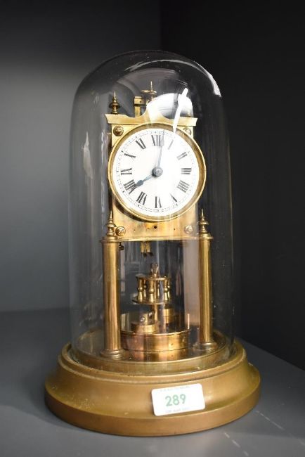 An early 20th century 400 day clock with cylindrical glass dome, h27cm Condition report: Require's suspension wire