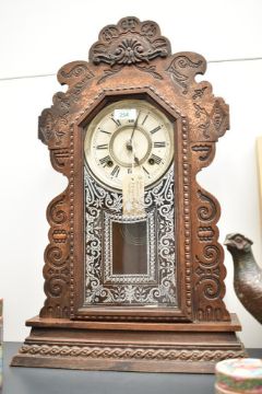 A late 19th century Ansonia (USA) Gingerbread clock having single gong chime, h56