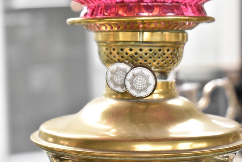 An early 20th century brass oil lamp with moulded cranberry frilled shade and glass chimney, h65cm