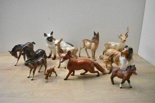 A large selection of Beswick Pottery and similar animal studies including 'Fox (Standing)' model number 1016A by Arthur Gredington in red-brown and white gloss finish and a 'Stag (Standing)' model number 981 by Arthur Gredington in light brown gloss finish having one antler damaged etc.