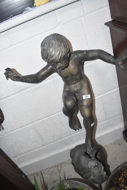 A bronzed garden ornament/water feature modelled as boy on snail,height to base approx. 75cm