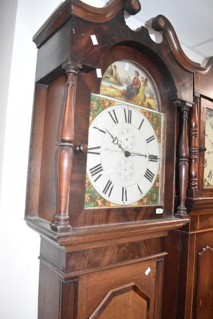 A 19th Century mahogany and oak long cased clock having 30hr movement and painted arched dial, named for Hargraves, Settle