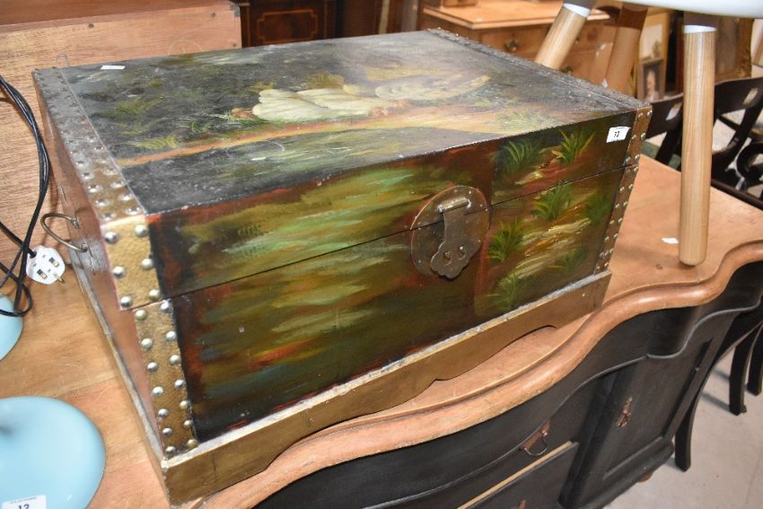 An Oriental style storage box having painted duck decoration , width approx. 62cm