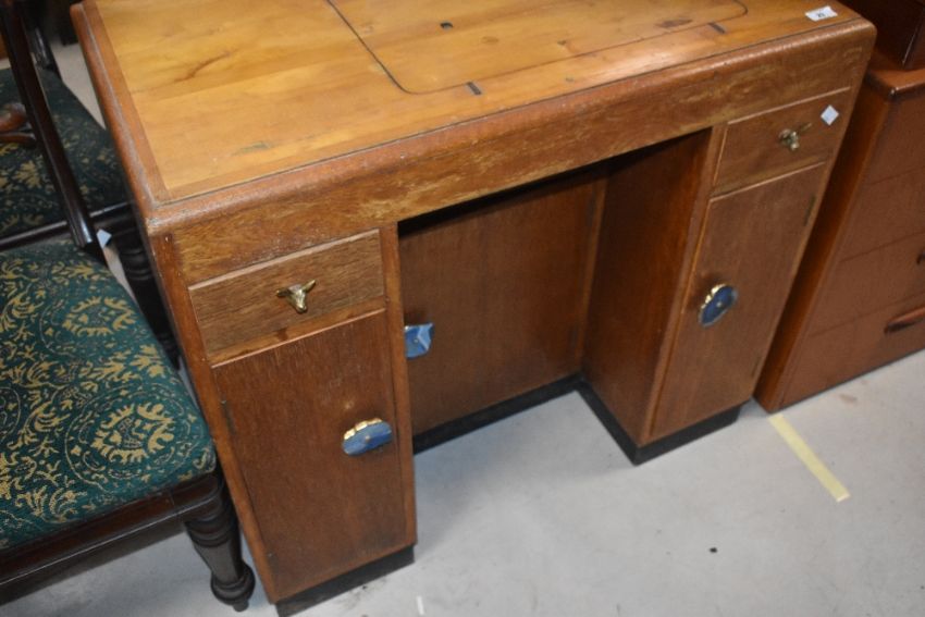A repurposed part oak sewing table , with animalistic and agate style handles