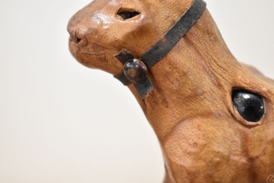 A pair of Liberty of London style Camel sculptures, having original saddles, glass eyes and aged leather on hand carved wood, largest H34cm ,( 2 )