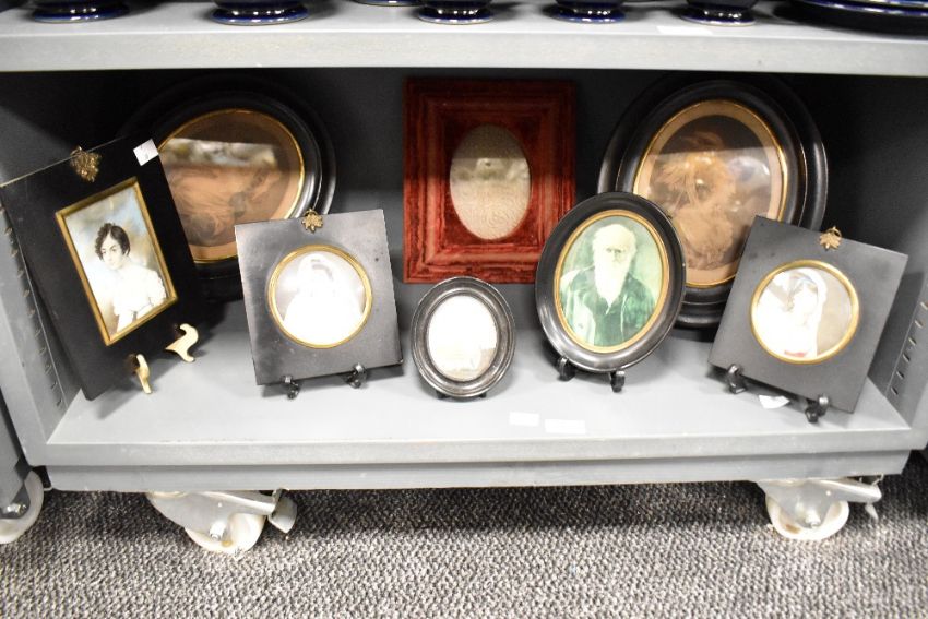 A 19th century miniature oval print of a gentleman held under glaze within a black lacquered frame, h17cm, sold together with various other prints ( 8 )