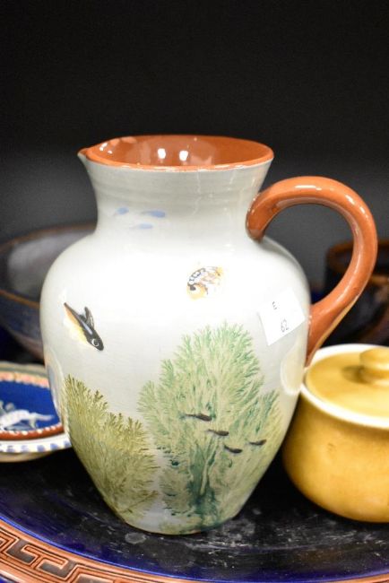 A Pilkingtons Royal Lancastrian blue mottled glazed tray, of shaped rectangular form with moulded mark to underside (chipped to rim) sold together with a selection of studio pottery mugs, bowls, lidded pots, jugs and other items including a large cobalt blue charger (af)