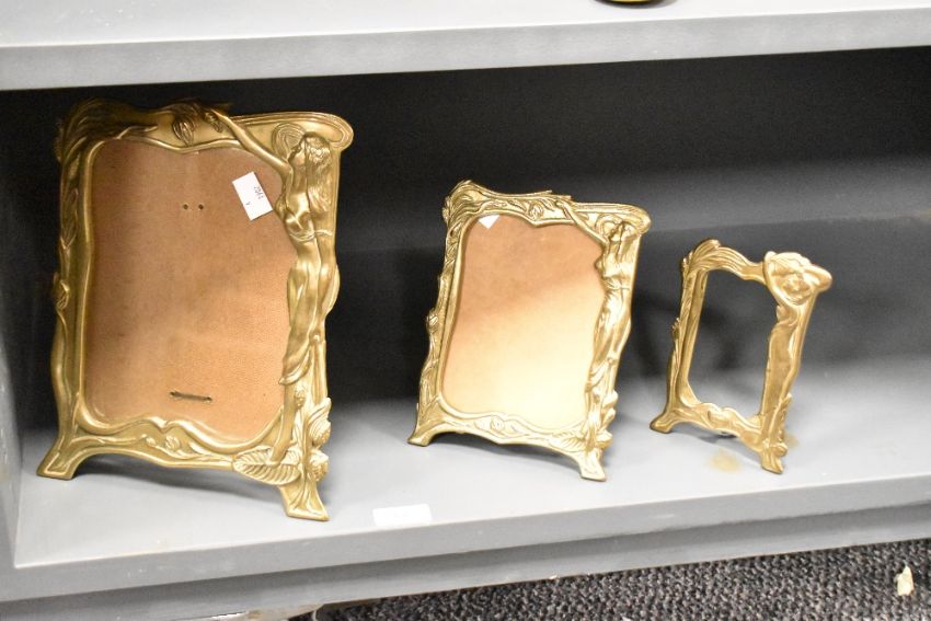 A group of three graduating cast-brass Art Nouveau style photograph frames, the largest measuring 25cm x 19cm