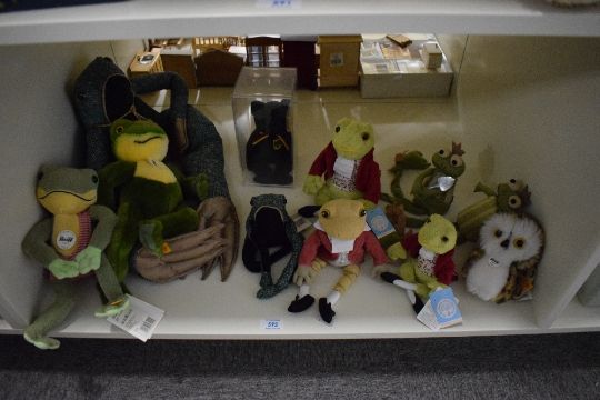 Steiff and similar Soft Toys, 064586 Froggy, 282225 Hippie Frosch, 045608 Wittie Eule, TY Bear and Frog, Gund Frog x2, Dora Designs Frog paperweight and Doorstop and two hand made Frogs