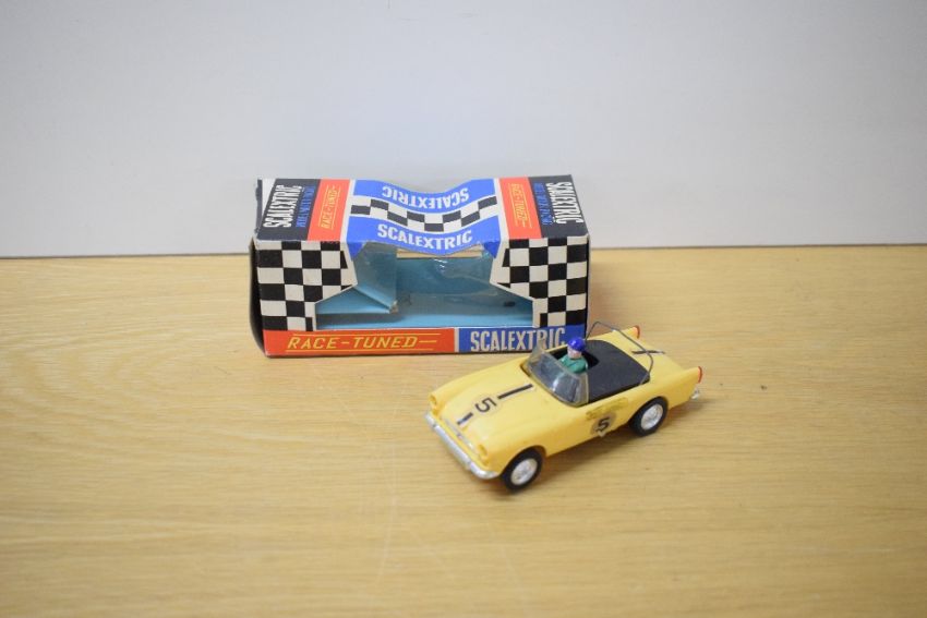 A Tri-ang Scalextric Race Tuned Car, C83 Sunbeam Tiger in yellow with racing number 5 and race tuned decal, driver wearing blue helmet, in original window display box with instructions present