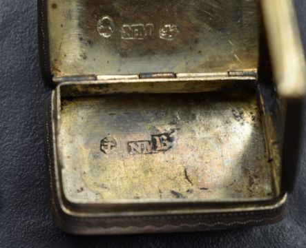 A George VI silver vinaigrette, of hinged rectangular form, having decorative engraving to the front and reverse, oval cartouche engraved 'M Douglas', gilt interior with hinged and floral pierced grille with sponge, marks for Birmingham 1825, maker Nathaniel Mills, 3.2cm x 2.4cm, 12g