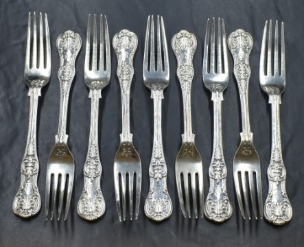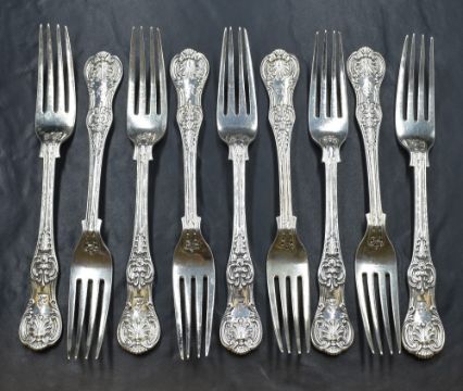 A group of nine Victorian silver Queen's pattern forks, having a horse heraldic crest to the terminals, marks for London 1864, maker Chawner & Co, 550g