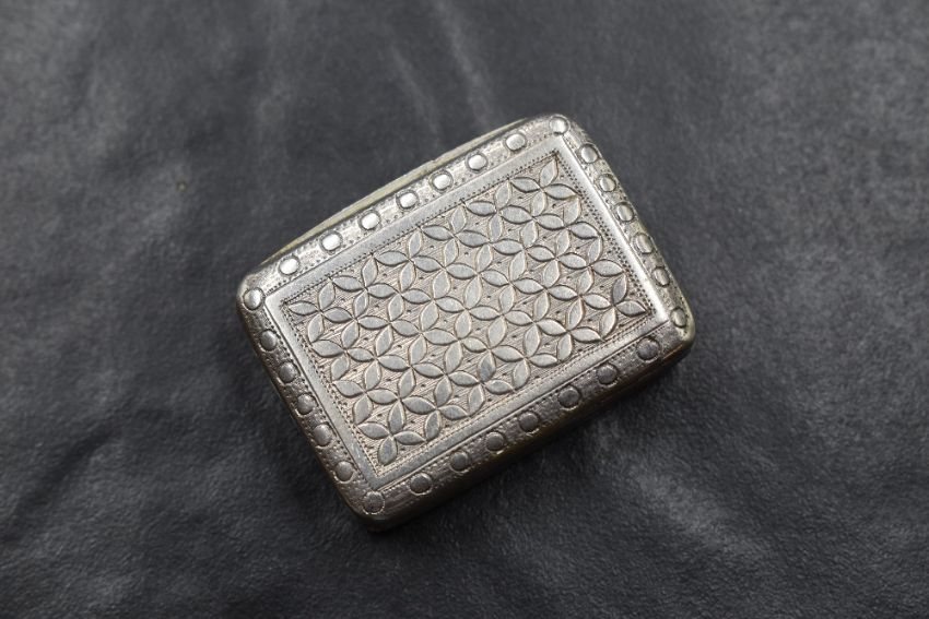 A George III silver vinaigrette, of hinged rectangular form, having decorative engraving to the front and reverse, rectangular cartouche engraved 'FS', gilt interior with hinged and pierced grille, sponge lacking, marks for Birmingham 1818, indistinct maker, 3.5cm x 2.5cm, 18g