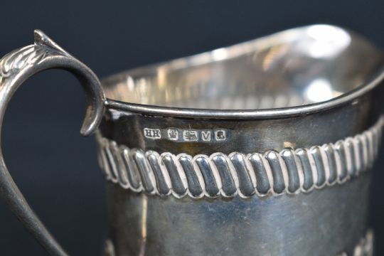 A Victorian silver three piece tea set, comprising a tea pot, sugar and cream, of oval form having a moulded rim with gadrooned decoration, and half gadrooned bodies, raised on oval feet, marks for Sheffield 1888, maker Harrison Brothers & Howson, 604g