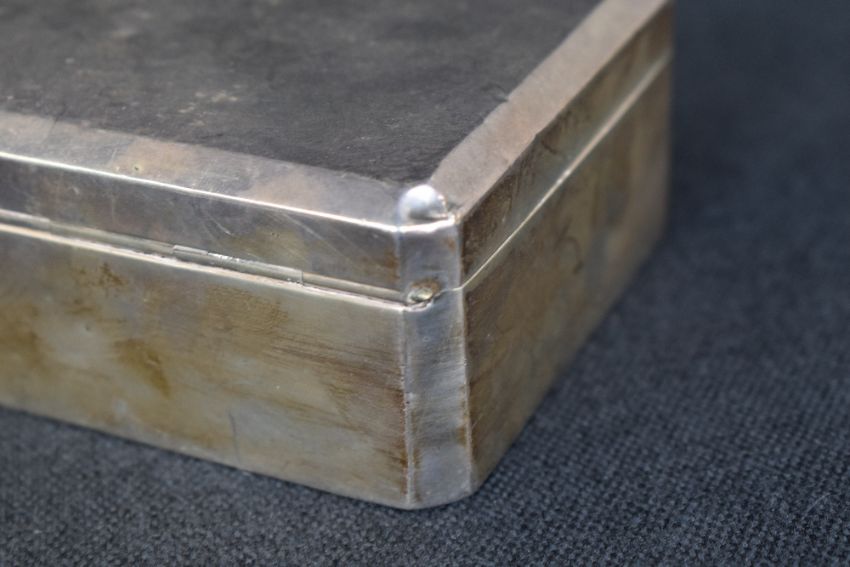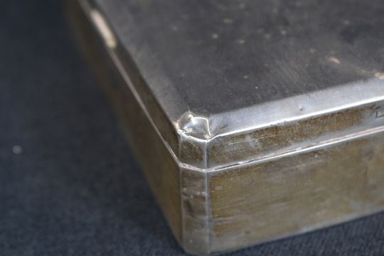 An Elizabeth II silver cigarette box, of hinged rectangular form, having canted corners with wooden lined interior, marks for Birmingham 1958, rubbed makers mark, 17cm x 9cm x 4cm, 448g. Dents and scratches to lid and body