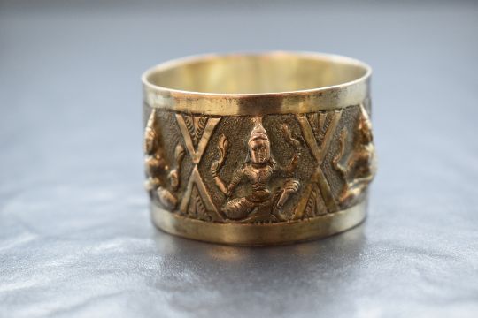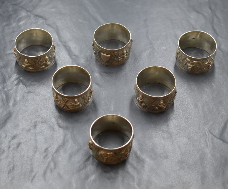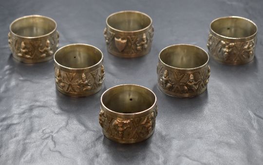 A group of six Eastern white metal napkin rings, depicting panels of human figures with vacant shield cartouches, 153g gross