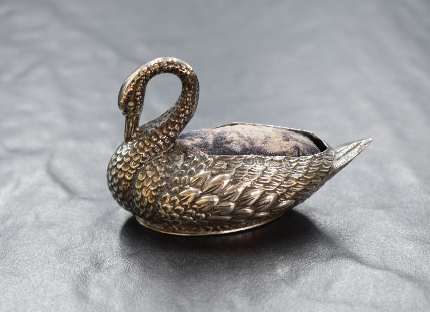 An Edwardian silver novelty pin cushion, modelled as a swan having dark fabric to the back, marks for Birmingham 1907, maker Adie & Lovekin Ltd, 8cm, 19.5g. Wear and damage to the fabric to the back.