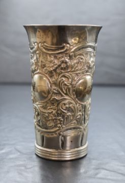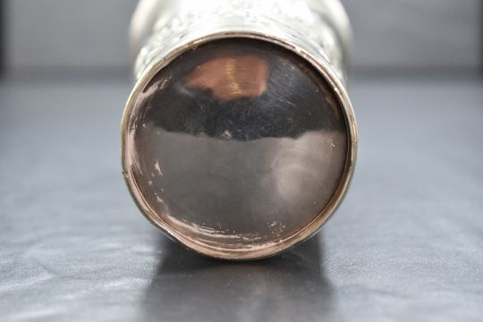 A late 19th/early 20th century silver vase, of cylindrical form having embossed scroll decoration with vacant circular cartouches, having rubbed hallmarks, 12cm, 136g