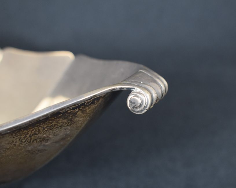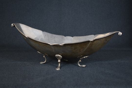 An impressive George V silver bowl, of boat form having a lobed rim, canted sides and scroll handles, raised on four cabriole style legs, marks for Birmingham 1911, maker Thomas Latham & Ernest Morton, 38cm x 18.5cm x 13.5cm, 657g