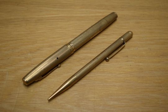 A Waterman lever fill fountain pen and propelling pencil set in 9CT Gold marked .375 with engine turned decal. Cartouche on both engraved HJH