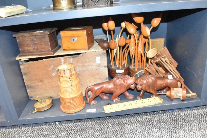 A oak lidded box, w37cm, sold together with a pair of lion figures, a measuring tap, a puzzle tower and two wooden money boxes ect, (15)