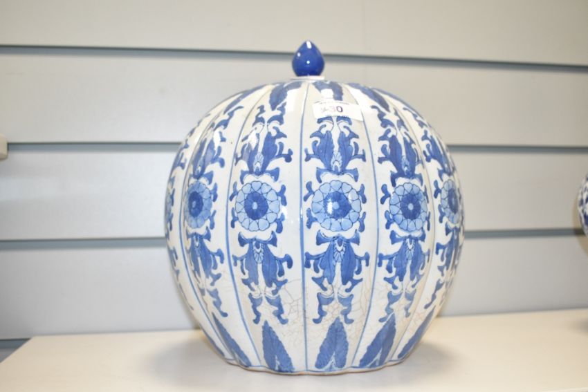 A 20th century blue and white lidded ginger jar having ribbed body and floral patterns, h26cm