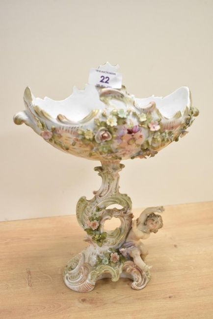 A German Sitzendorf porcelain centrepiece, decorated with foliage and cherubs, painted mark to base, h26cm