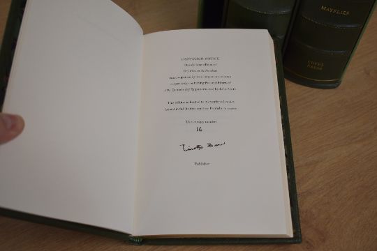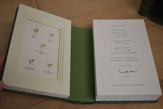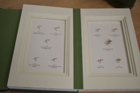 Fishing & Angling. Limited Edition. Griffiths, Terry [ed.]. - Dry Flies in the Sunshine. J. W. Dunne and his Dry Fly Patterns. Creel Press, 2008. Edition De Luxe, one of 25 copies (this copy no.16), signed by the publisher. Three volumes, one text and two flies. 20 specimen flies, tied by John Smith, displayed in five sunken mounts across two volumes, several having moth damage (see images). Bound in original green full goatskin, housed in slipcase. (1)