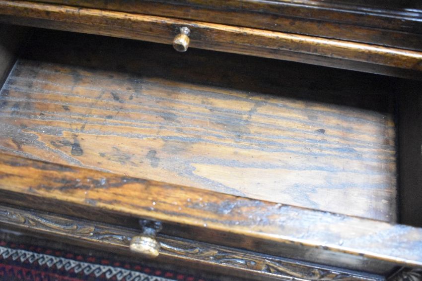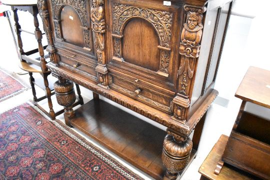 A Titchmarsh and Goodwin oak court cupboard having double cupboards over slide and drawers, approx dimensions W128 D53 H138cm