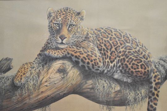 After Kim Brooks (British b.1936) colour print, Leopard resting on a tree branch, within a card mount and metallic gilt frame, under glass 50cm x 75cm & 65cm x90.5cm overall.