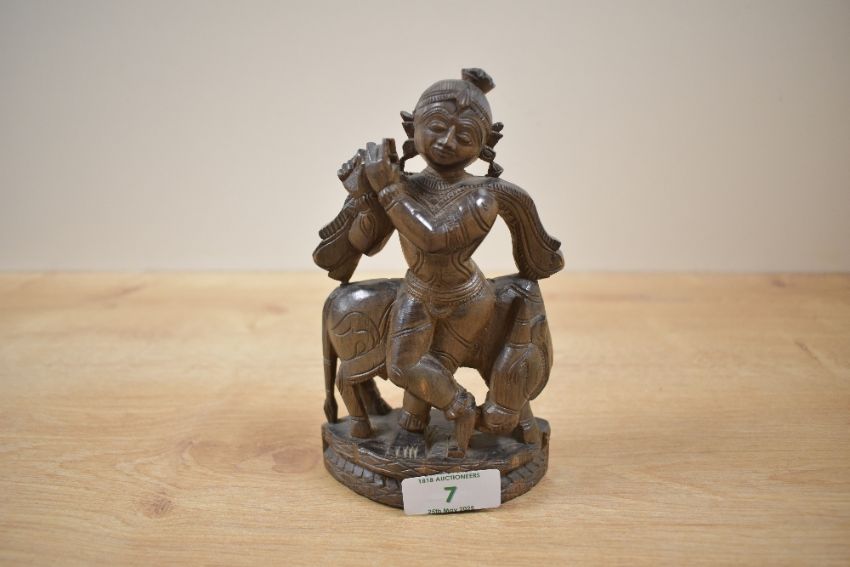 A hand carved Buddhist sculpture of cow and figure playing the flute, h15cm Condition report: Missing flute.