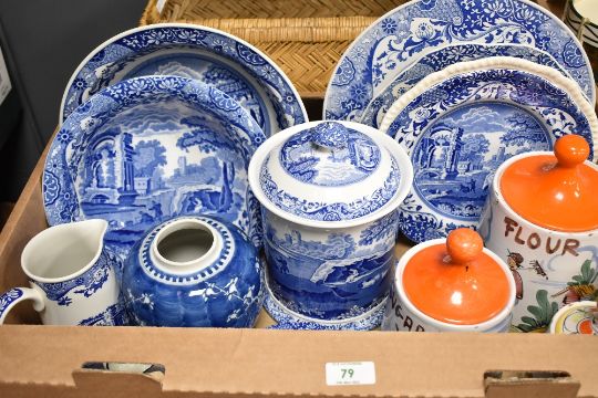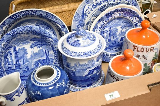 A set of 3 lidded flour, sugar and tea jars, hand coloured depicting Sicilian countryside scenes, largest h22cm, sold together with various ceramics, to include Spode, Copeland and Mabbin China (13)