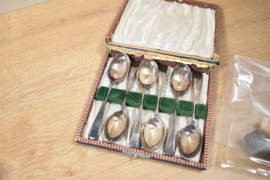A small selection of clay pipes and pipe bowls and a cased set of dessert spoons