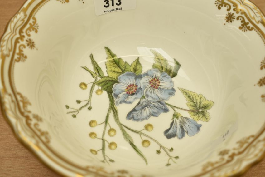 A Spode 'Burtonia' pattern bowl having gilt edges and floral designs, raised on a ruffled foot, h10cm