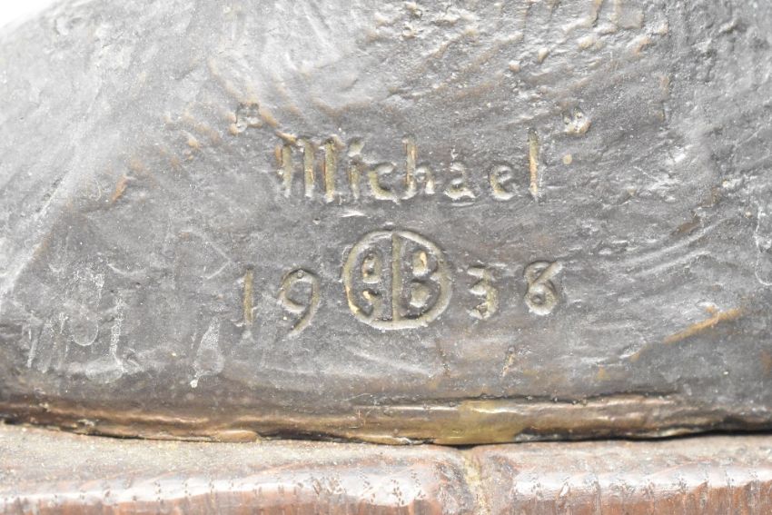A metal bust of a boy raised upon a wooden base, signed to back 'Michael AB 1938', H24.5cm