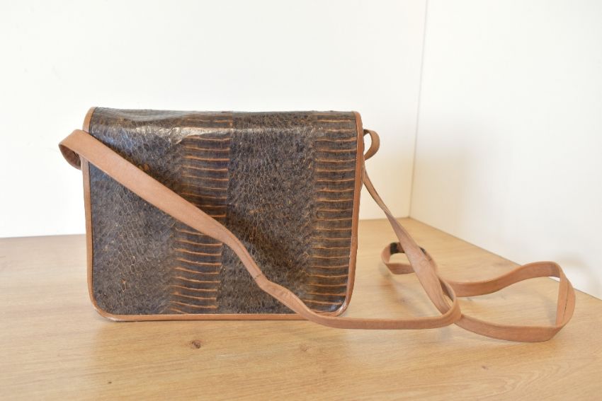 Five leather bags comprising three frame structured handbags, a cocoa brown Waldybag, a taupe Made in England, and a beige quilted textured leather purse style, all having brass frame closures, along with a smooth beige leather and snakeskin corss-body bag, and a pleather shoulder bag with tonal stitched panel detail.