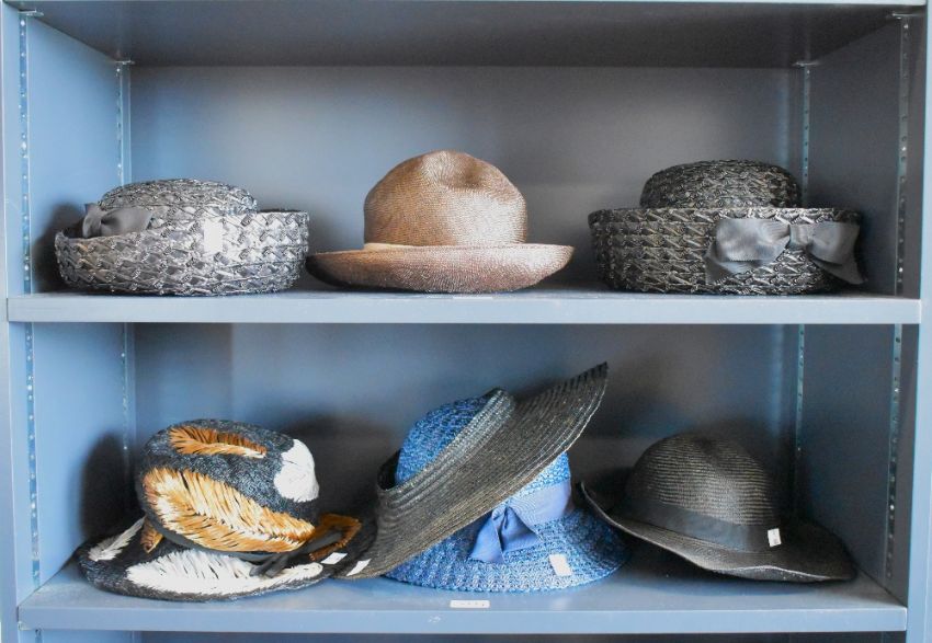 Thirteen vintage straw and paper woven hats, mostly in natural, black, browns, or navy.