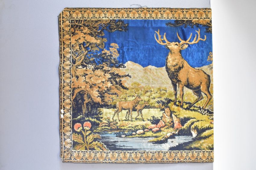 A vintage wall hanging or area rug in woven velvet, depicting a stag and deer in a wooded glade with mountains in the backdrop and stream in the fore, using a vivid blue hue for the sky along with chartreuse, coral, gold and black throughout. Lovely condition.