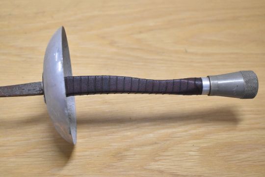 Vintage Leon Paul fencing foil, makers name PAUL visible beneath rust and tarnish, blade bent near tip 89cm, 107cm overall. Sold together with two French rapiers, both stamped 5 and S A, one stamped PARIS, the other stamped but not discernable, extremely rusted and tarnished, one with broken end 59cm, overall 78cm, the other 89cm, overall 108cm.(3) Buyer must be over 18, proof of identity required.
