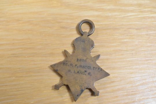 WW1 1914-15 trio of medals as awarded to Lance Corporal Rupert Francis RADCLIFFE, who was born in Grange-over-Sands and served in France & Flanders with 1/5th Battalion, King's Royal Lancaster Regiment and latterly with the 1/7th Battalion Cheshire Regiment, possibly having been wounded and/or invalided at some time, comprising 14-15 star, BWM and VM impressed 1828 PTE.R.F. RADCLIFFE. R. LANC. R. The VM having some verdigris damage, no ribbons on star or BWM. Sold together with recipient's named aluminium dog-tag, noting C.E. And 5.R.LANC.R. Online sources confirm entitlement, Regimental change, that recipient was disembodied 7/3/1919 and died in Ulverston aged 82.(4)