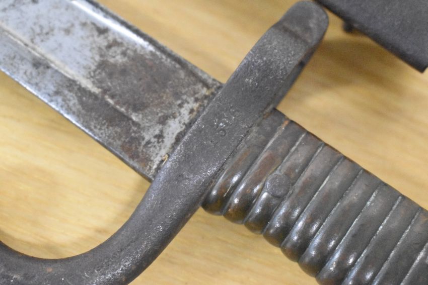 WW1 French 1866 Pattern Chassepot bayonet with single edged fullered blade, French motto and date 1870 on spine visible beneath tarnish, 57cm, crossguard rust pitted and stamped R 1506, release catch in working order, scabbard rust pitted, 71cm overall. Sold together a WW1 French M1874 Gras Bayonet with single edged blade in clean, bright condition, French motto and date 1878 on spine clearly visible, 52cm, crossguard rust pitted, release catch in working order, scabbard rust pitted, 66cm overall.(2) Buyer must be over 18, proof of identity required.