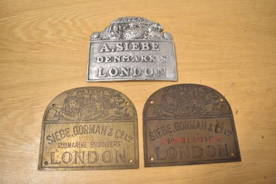 Dreadnought submarine painted wooden plaque, two Siebe, Gorman & Co Ltd Submarine Engineers London metal plaques, one A. Siebe Denmark St London metal plaque, Royal Navy playing cards depicting ships and their details, one full pack and one pack missing some cards, two hardback pictorial books, Submarine by Antony Preston and Modern Submarine Warfare by David Millar and John Jordan.(Lot)