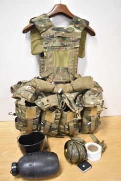 1980s British Army Discipline camouflage webbing backpack, consisting of eight pockets and containing plastic eating/drinking vessel, water bottle, ear defenders, roll of white tape, magnifying glass, first aid sterile field dressing 10cm x 19cm, Camtech military sunscreen, bungee and scrim scarf. All plastic catches in good working order, very clean condition, useful piece of kit.(1)