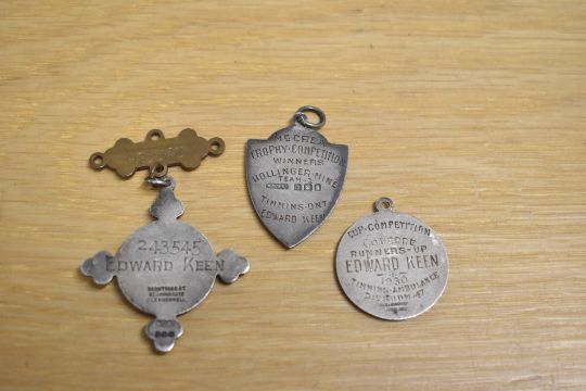 Poignant collection of St. John Ambulance Association silver medallions with Canadian interest as awarded to EDWARD KEEN, later killed in a mining accident in Canada, comprising a hallmarked shield With SJAB crest from Ontario Council dated 1930, engraved on rear McCrea Trophy Competition Winners Hollinger Mine Team 1 Timmins Ont EDWARD KEEN, another hallmarked, circular with SJAB crest, having four trefoil arms, engraved on rear 243545 EDWARD KEEN with suspension bar dated 1929 with trefoil ends, numbered on rear 243545 and another, JR Gaunt Sterling, circular with SJAB crest, engraved on rear Cup Competition Coderre Runners-Up EDWARD KEEN 1930 Timmins Ambulance Division 47. Approximately 30gm silver content.(3) Sold together with ORIGINAL Temiskaming and Northern Ontario Railway's Telegraph dated Timmins, Ont Apr 13th 1932 to Mrs E.B. Keen in Barrow-in-Furness, Cumbria 'Regret to advise Edward Keen killed in a mining accident at Hollinger last night' an ORIGINAL Certificate of Registration of Death for Edward Keen, aged 29years 10mths and five ORIGINAL newspaper cuttings relating to the awards of the above medallions, the funeral and the circumstances of the accident at Hollinger Mine in which Edward Keen sadly lost his life. (Lot)