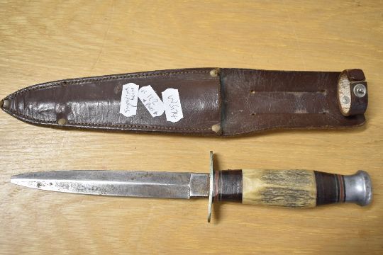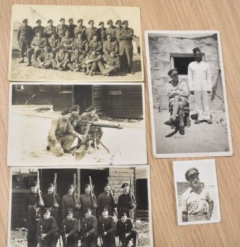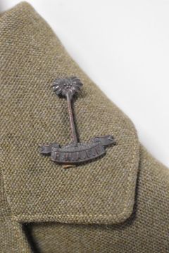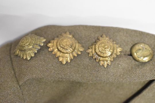 WW2 period Royal West African Frontier Force Officer's Dress Uniform, comprising jacket, trousers, cloth belt, the jacket having full complement of RWAFF badges and buttons and with Captain's rank pips, WW2 medal ribbons for 1939-45, Africa stars, Defence and War Medal. Some moth damage. Sold together with Officer's Sam Browne leather shoulder belt annotated R S Wilkinson, with leather pistol holster. Also with two desert-khaki uniform jackets, one with Army General Service Corps buttons and WW2 medal ribbon for the Africa star, the other with all buttons removed and a pair of khaki shorts, also with a fighting-style knife with broken tip in leather sheath.(Lot) All items are believed to have been the property of Roger Sharp WILKINSON, born Ulverston 1910 and died 1964 in Carlisle, Cumbria. This gentleman appears to have joined and served with the Tank Corps during World War Two and was later Commissioned and served with the RWAFF in Africa. Online sources confirm award of the four medals as depicted by the ribbons above and that he was discharged as a Captain in the Pioneer Corps in October 1945, number 284593, claiming his medals in March 1949. Directly from the family, there are copies of photographs available to successful bidder of recipient as a Sergeant in Tank Corps uniform and as a Captain RWAFF in uniform. Also sold with an old African tribal leather-bound decorative wooden arrow quiver containing six metal-tipped arrows in damaged state, the quiver in reasonable condition with a removable top and multi-tassled, as brought back from Africa, probably as a momento of his time there, by Captain Wilkinson. A nice, interesting and scarcely seen lot. NOTE: In peacetime, the Royal West African Frontier Force (RWAFF) had numbered five Battalions of infantry, but during the war increased to several dozen plus ancillaries. Each RWAFF infantry battalion included over 80 white Europeans. In total, white Officers and Non-Commissioned Officers constituted 14.6% of the RWAFF. Normally, the Officers were British ones who had volunteered to temporarily serve in Africa and then return to their old unit.