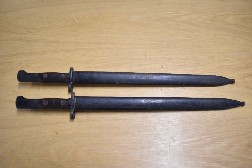 WW1/WW2 Lee Enfield bayonets, 38cm blade, no marks or maker's name, with painted metal scabbard, 51.5cm overall. Both in good condition for age, with very little rusting or discolouration.(2) Buyer must be over 18, proof of age required.