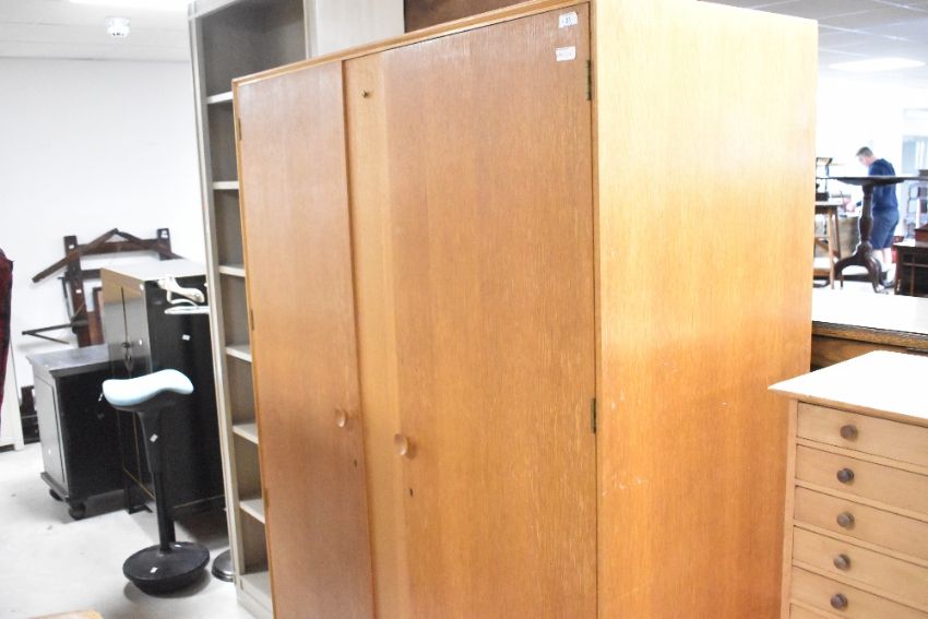A vintage golden oak wardrobe and dressing table, labelled Meredew