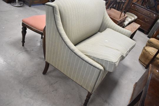 A Victorian style stained frame salon settee with later tweed upholstery, width approx. 137cm, in light grean and cream, labelled Beaumont & Fletcher , London, good clean condition