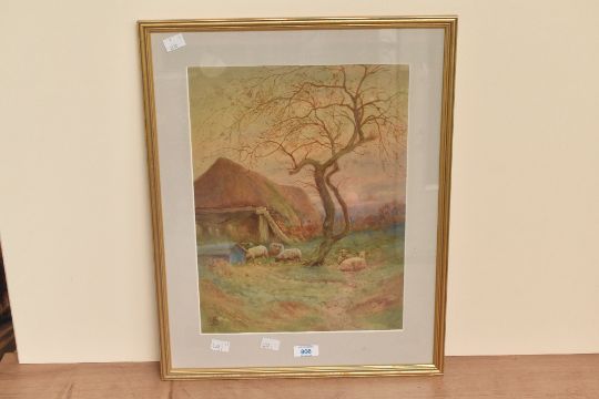 T. Murray Bernard Blaydon (British 1864-1939) watercolour, 'Evening in late Autumn, A Warwickshire Farmyard' pastoral scene with sheep, artists monogram/cipher lower left, within a card mount and moulded gilt frame, under glass, hand-written label verso reading 'on rear of artwork Evening in late autumn........Murray B Blaydon, Old Yardley, Birmingham 1909' 38cm x 29cm & 51.5cm x 41.5cm overall.