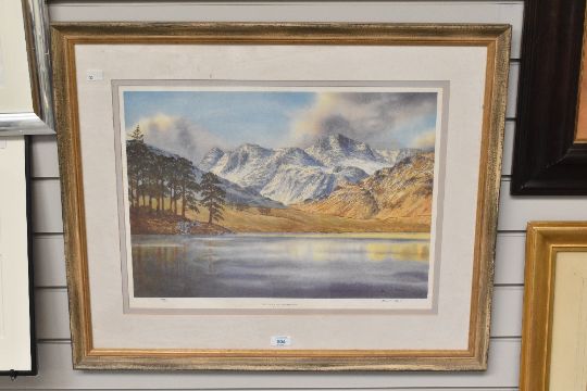 After Neil J Barlow (Contemporary) 'The Langdale Pikes from Blea Tarn' limited edition colour print, signed lower right, edition number 147/650, within step mount and brushed gilt frame, under glass. 37cm x 52cm, 62cm x 74.5cm overall.